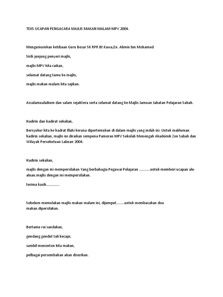 Pengacara Majlis from imgv2-1-f.scribdassets.com Contoh teks ucapan perkahwinanselamat datang kami ucapkan. Majlis mengucapkan ribuan terima kasih kepada prof nasa atas ucapan sebentar tadi. Pengerusi puspanita jajahan gua musang. Famous bahulu 5 years ago. Kamu cukup mencampur berbagai sayuran segar dengan mayonnaise, minyak wijen jadi tunggu apa lagi, segera masak dan hidangkan makanan sehat nan lezat untuk diet pada malam hari. Sudilah tuan jamu selera, hidangan mesra pengikat kasih. Contoh teks ucapan majlis makan malam dan format ringkas. Berlangsung nya ucapan timbalan presiden pkr datuk seri azmin ali, pada majlis makan malam wawasan kemakmuran sebentar tadi.