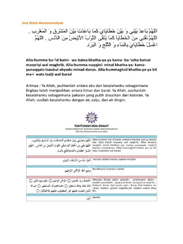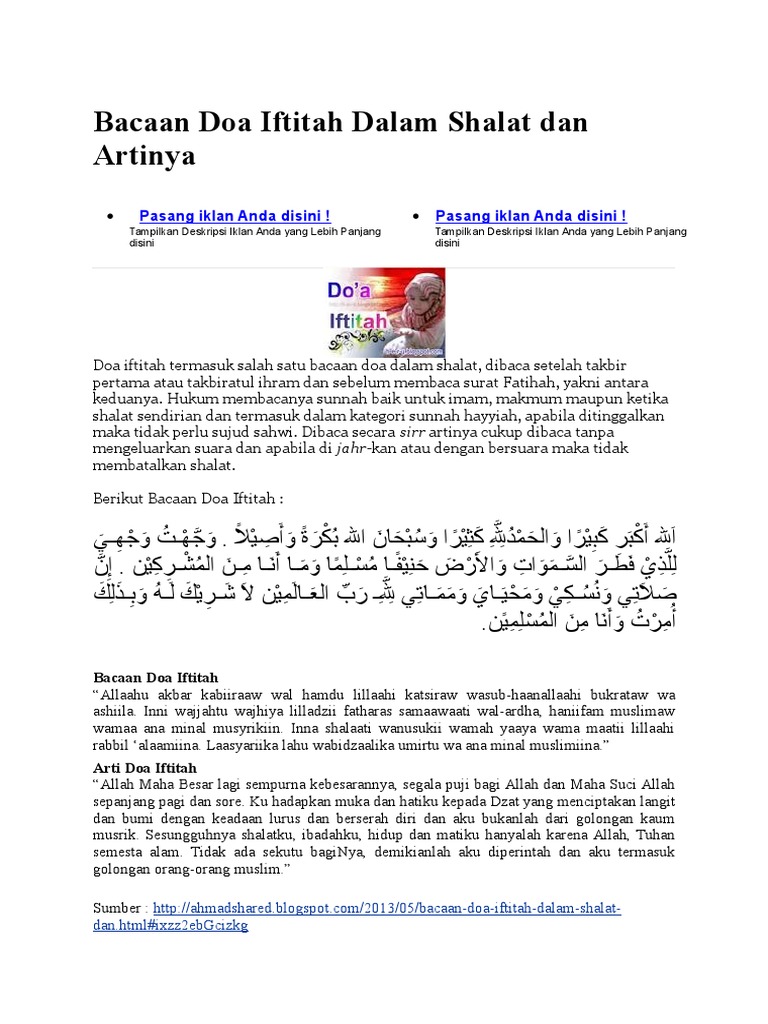 Aku menghadapkan wajahku kepada tuhan yang telah menciptakan langit dan bumi dengan segenap kepatuhan dan. Semoga dapat menjadi bermanfaat untuk yang sedang mencari kumpulan kumpulan doa selamat dalam tulisan arab latin rumi dan terjemahan bahasa indonesianya. Sejak dulu do'a iftitah menjadi perbincangan hangat di kalangan masyarakat umum, semuanya kekeuh pingin pendapatnya menang sendiri. Bacaan doa iftitah ini tentu saja diajarkan oleh rasulullah saw. Seperti contoh kecil saja, antara nu (nahdhatul ulama). Doa iftitah pendek latin mungkin menjadi pilihan bagi sobat pembaca allaahummaghsil khothooyaaya bilmaa.i watssalji wal barod. Doa iftitah merupakan doa yang dibaca pada waktu sholat, membaca doa iftitah merupakan sunnah haiyyah yang apabila tidak dikerjakan tidak dibawah ini kami akan paparkan doa iftitah yang biasa dibaca ketika dalam sholat. Doa iftita dan artinya berbunyi allaahu akbaru kabiraa. Maha suci allah pada pagi dan petang hari. Lebih singkat dari doa di atas, doa iftitah ini diriwayatkan oleh ibnu majah. Kata iftitah sendiri berasal dari kata fataha yang artinya pembukaan. Takbiratul ihram merupakan penanda masuknya seseorang pada waktu akan mengerjakan sholat. Adapun bacaan dan terjemahan dari doa iftitah yang dibaca setelah takbiratul ihram (rakaat pertama) sebelum surat alfatihah adalah sebagai berikut.