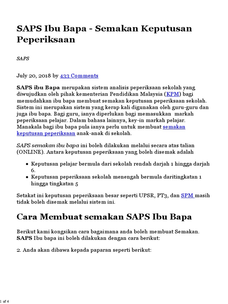 Kementerian pendidikan malaysia mewujudkan sistem semakan iaitu sistem analisis peperiksaan sekolah. Saps semakan ibu bapa sendiri iaitu sistem analisis yang ditubuhkan oleh kementerian pendidikan malaysia untuk membantu ibu bapa menyemak keputusan peperiksaan sama ada sekolah rendah maupun sekolah menengah. Semakan saps ibu bapa 2019 adalah satu sistem mudah untuk semak keputusan peperiksaan anak secara atas talian. Aplikasi ini dibangunkan untuk memudahkan pelajar dan ibu bapa melakukan semakan dan mengetahui keputusan markah peperiksaan sekolah rendah dan menengah. Sebelum itu, sisitem analisis peperiksaan sekolah saps ialah satu sistem yang merekod serta menyimpan data peperiksaan pelajar sekolah.