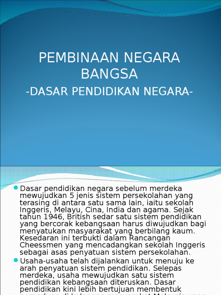 Pelan tindakan pendidikan lemah, bukan dasar. Dasar pendidikan negara memiliki asas yang kuat sebagai dasar baik dalam pelan pembangunan pendidikan malaysia. Bahasa kebangsaan sebagai bahasa pengantar; Assalamu alaikum warahmatullahi wabarakatuh dan salam 1malaysia, syabas dan tahniah atas inisiatif menerbitkan buku dasar pendidikan kebangsaan kpm. Dasar pendidikan kebangsaan perutusan ketua pengarah pelajaran malaysia bismillahirrahmanirrahim.